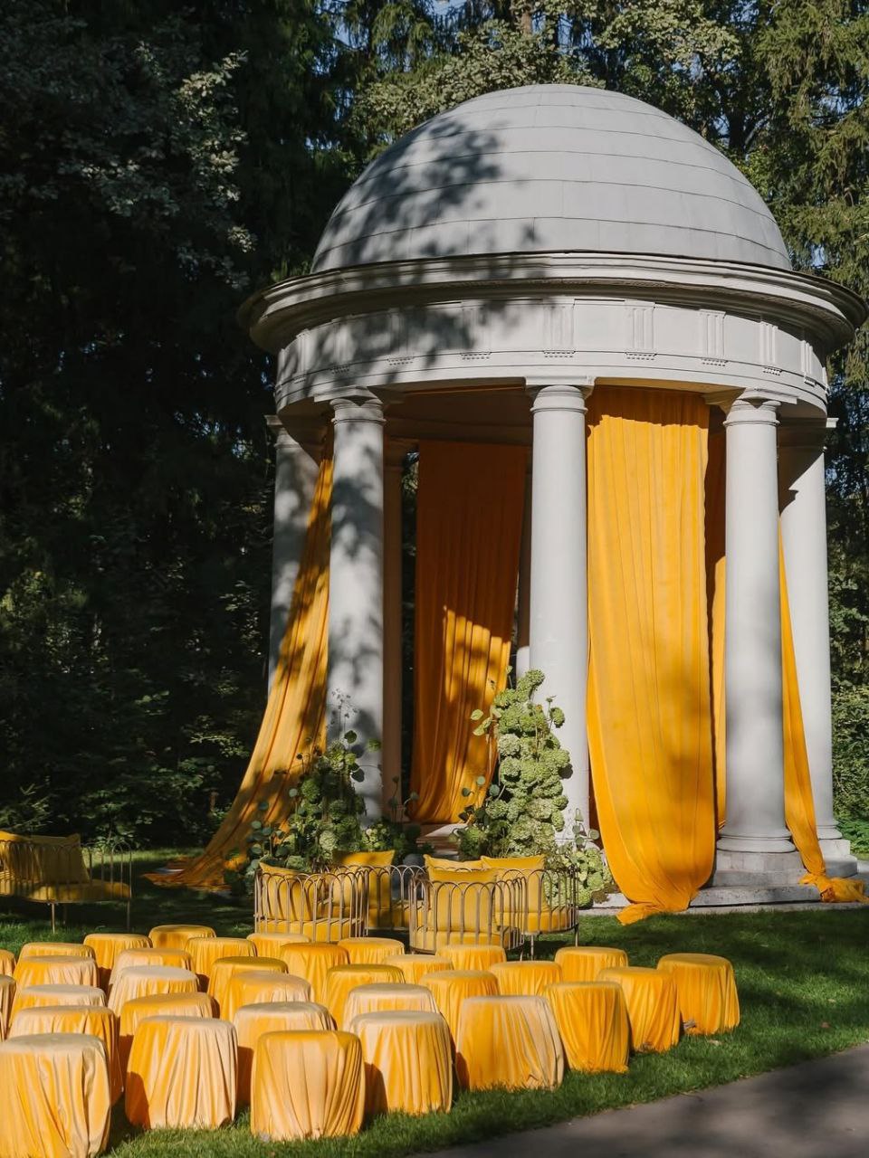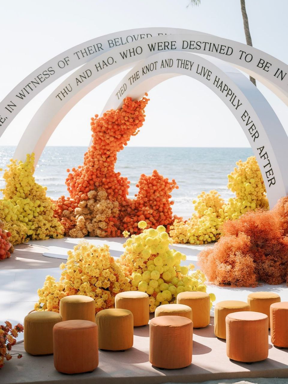 Radiant, joyful, and bursting with energy, orange and yellow is a palette made for couples who want their wedding to feel like pure sunshine. This combination instantly uplifts the mood, creating a celebration that feels warm, dynamic, and unforgettable. Imagine a ceremony framed by marigolds, citrus accents, and glowing candles in amber tones — a scene that embodies optimism and vitality.For those searching for colorful wedding ceremony ideas, orange and yellow offer endless possibilities, from tropical-inspired décor to rustic autumnal charm. It’s also an excellent choice for couples who love bold statements and want their celebration to be remembered for its vibrancy. Whether you use orange poppies and yellow tulips for a spring wedding or incorporate citrus fruits into your summer décor, this palette adds a playful, modern touch. It perfectly embodies vibrant wedding ceremonies while giving space for creative wedding ceremony ideas that feel both stylish and unique.