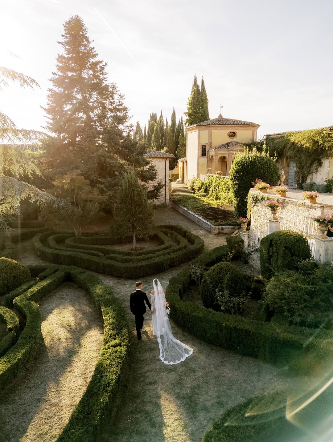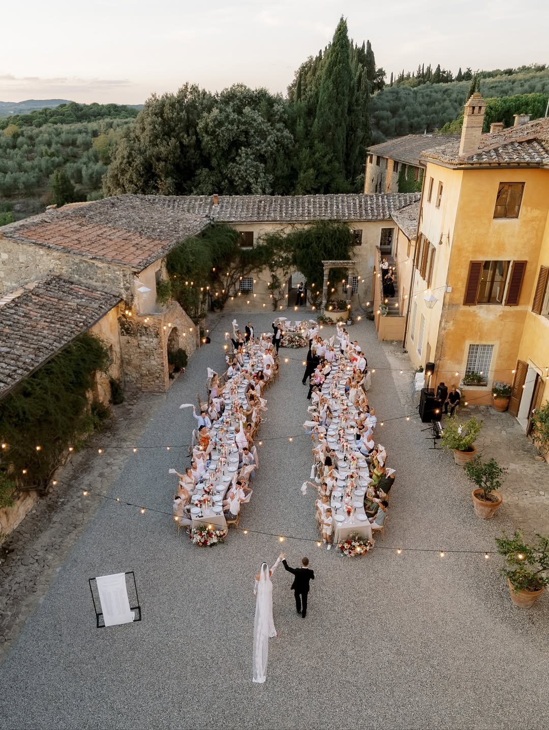 Tuscan romance, distilled to its purest form. Imagine earth-toned stone and silvery olive groves, their gentle textures mingling with couture elegance. Catignano stands apart among Italy’s villa weddings, offering rustic sophistication: medieval towers crown rolling hills, stone courtyards glow in the golden hour, and cypress-lined paths invite you to wander. Here, Tuscany feels genuine, never contrived, and every photograph is bathed in sunlight and steeped in timelessness.