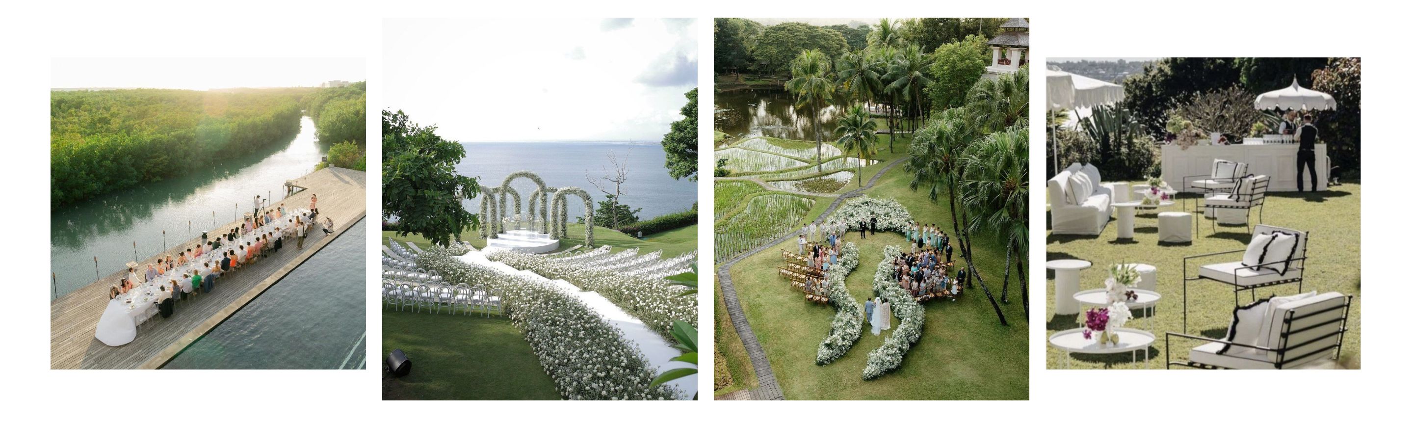 Setting up a table around the water creates a serene and picturesque dining experience. Whether by a lake, pond, fountain, or pool, the presence of water adds a tranquil and refreshing ambiance. The table can be decorated with elements that complement the natural surroundings, such as flowers, greenery, and candles. Dining by the water provides a unique and memorable experience for guests, enhancing the overall atmosphere of the event. This approach is perfect for outdoor events where the natural beauty of the water can be incorporated into the decor.