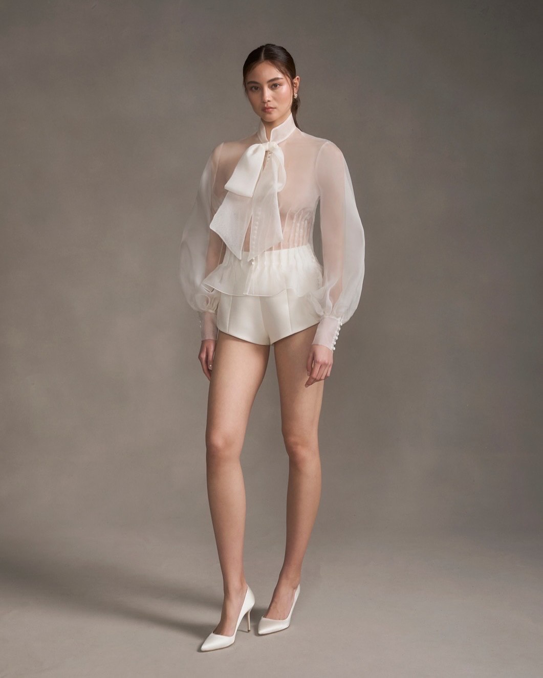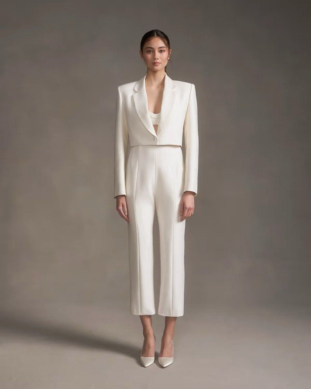 - Texture and layering add depth. Wearing a silk camisole under a blazer adds a bit of quiet luxury. A soft lace bodysuit adds romance. Tying a bold silk scarf around the neck brings old-fashioned elegance. Wearing a see-through blouse under a fitted blazer makes the outfit look more interesting. These layers keep the white bridal suit from looking plain or flat in photos.
