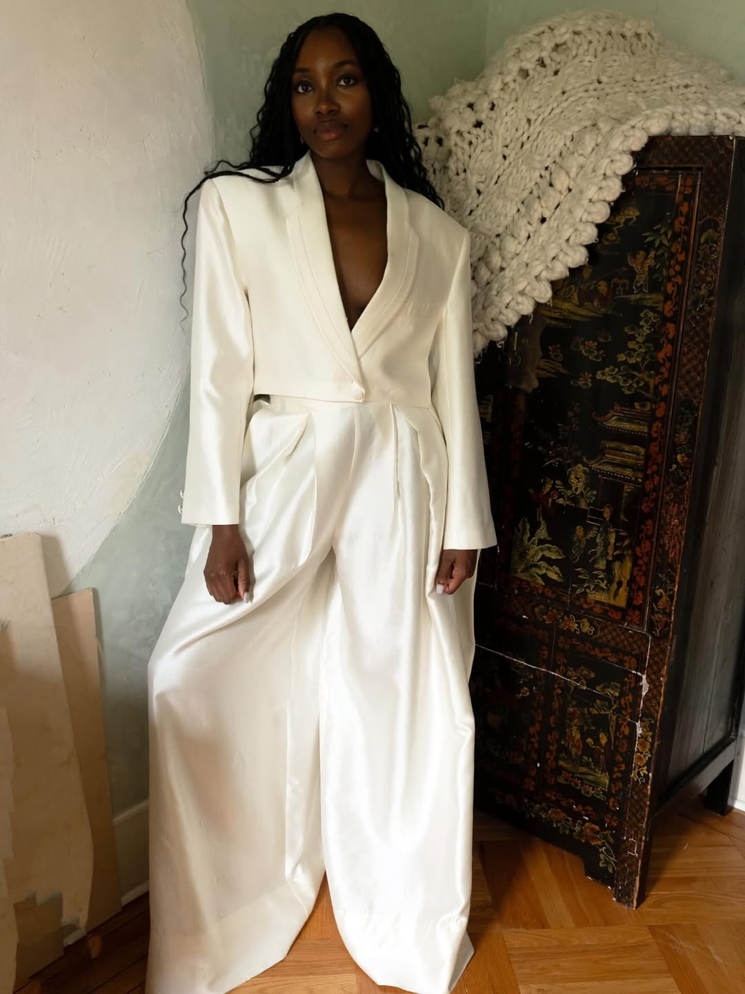 What makes pantsuits so appealing to brides in 2026 is their flexibility. Wear them with a simple silk top under the blazer for a clean, elegant look. Add a long veil flowing from a low bun, and the outfit instantly looks perfect for a bride. Change classic heels for sharp, pointed flats, and the style becomes more relaxed and chic. The choices for white suits for women now include fancy fabrics like satin, which shines in the light; smooth silk, which looks great in photos; and even light wool with a soft sheen that feels rich but not heavy. The relaxed tailoring is worth noting. This is not about looking like you are wearing men's clothes, but about creating a feminine shape through how the clothes hang and their size, not by using tight or flared shapes. A large blazer that gently follows the body rather than fitting tightly adds a stylish shape, while wide-leg pants make you look taller and let you move more easily. This makes the white wedding suit perfect for ceremonies where you will be standing, walking, and maybe even dancing, giving you comfort and style at the same time. These suits are perfect for minimalist weddings, city hall ceremonies, destination celebrations or any occasion where the bride wants to look and feel like her elevated everyday self rather than a princess for a day. The white bridal suit becomes a canvas for personal style: add bold jewellery for drama, keep accessories minimal for Zen elegance, or layer textures with silk scarves and delicate veils for a romantic touch.