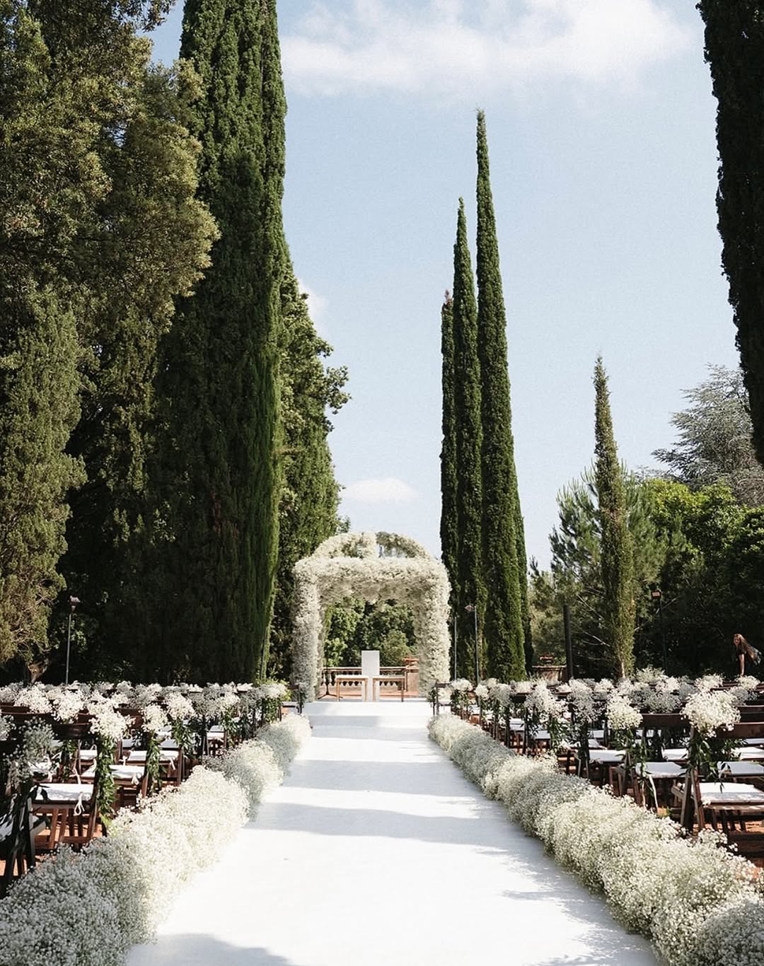 Tall pines stretch skywards while immaculately groomed lawns extend below. The farmhouse façade rises behind you. This spot is a popular choice for couples to get married, and it's easy to see why. The combination of natural beauty and architectural elegance is truly breathtaking.
