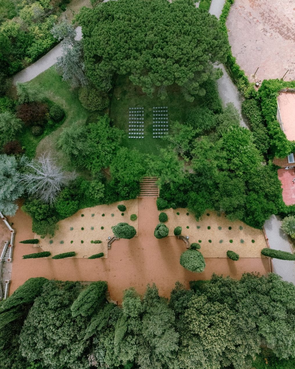 The garden's name is an accurate reflection of its nature. The unique terracotta sand gives rise to a distinctive landscape that is truly one of a kind. A symmetrical design is showcased, with ancient holm oaks and cypress trees standing guard. An original spiral staircase winds up one side, while an elegant 20th-century staircase balances the other.