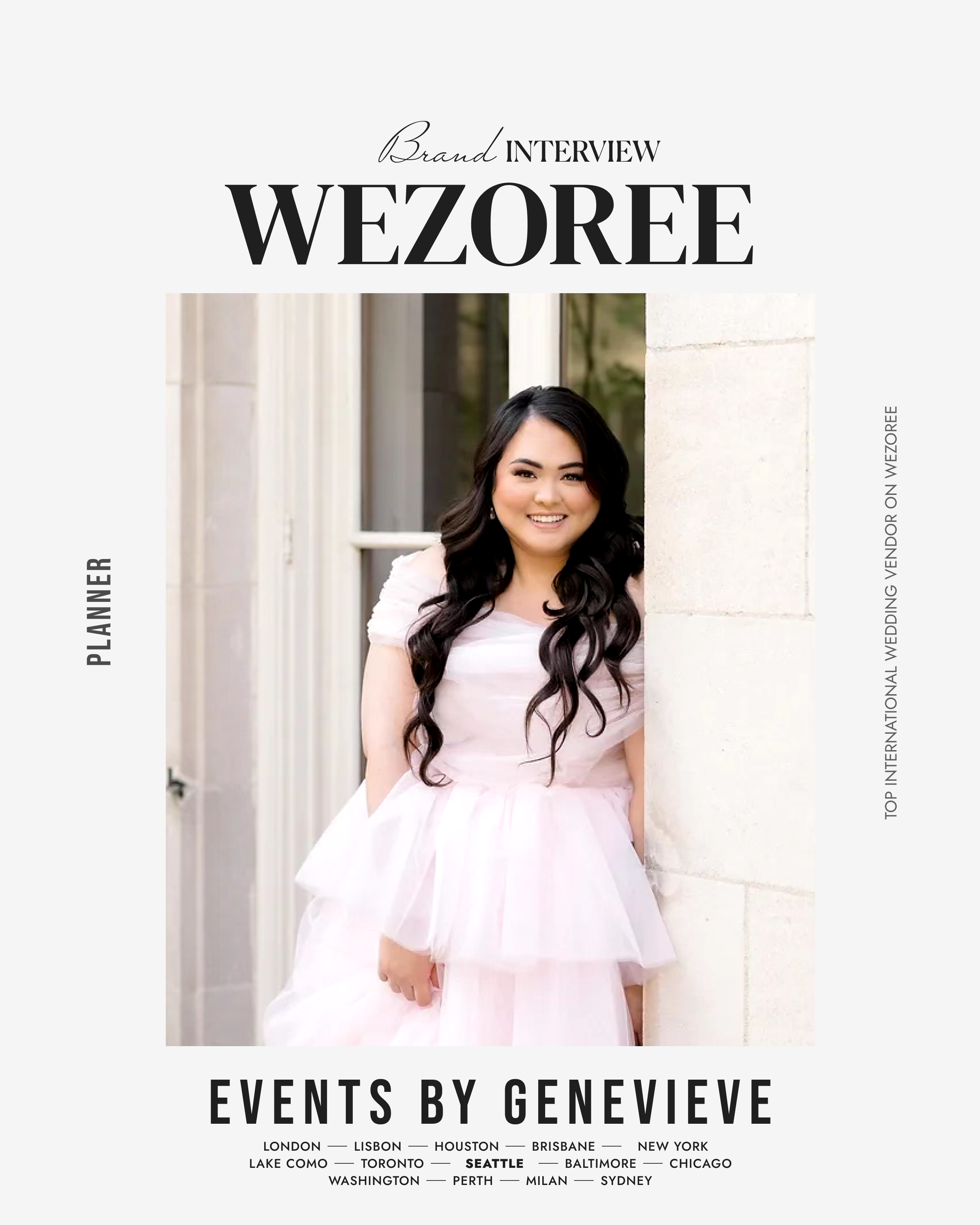 In the Emerald City's bustling wedding scene, Events by Genevieve carves a niche as an astounding event planner, distinguished by a trio of Wezoree Awards. Based in Seattle, this wedding planning virtuoso transforms nuptials into flawlessly executed celebrations, earning an undeniable reputation across the picturesque cityscapes and beyond.