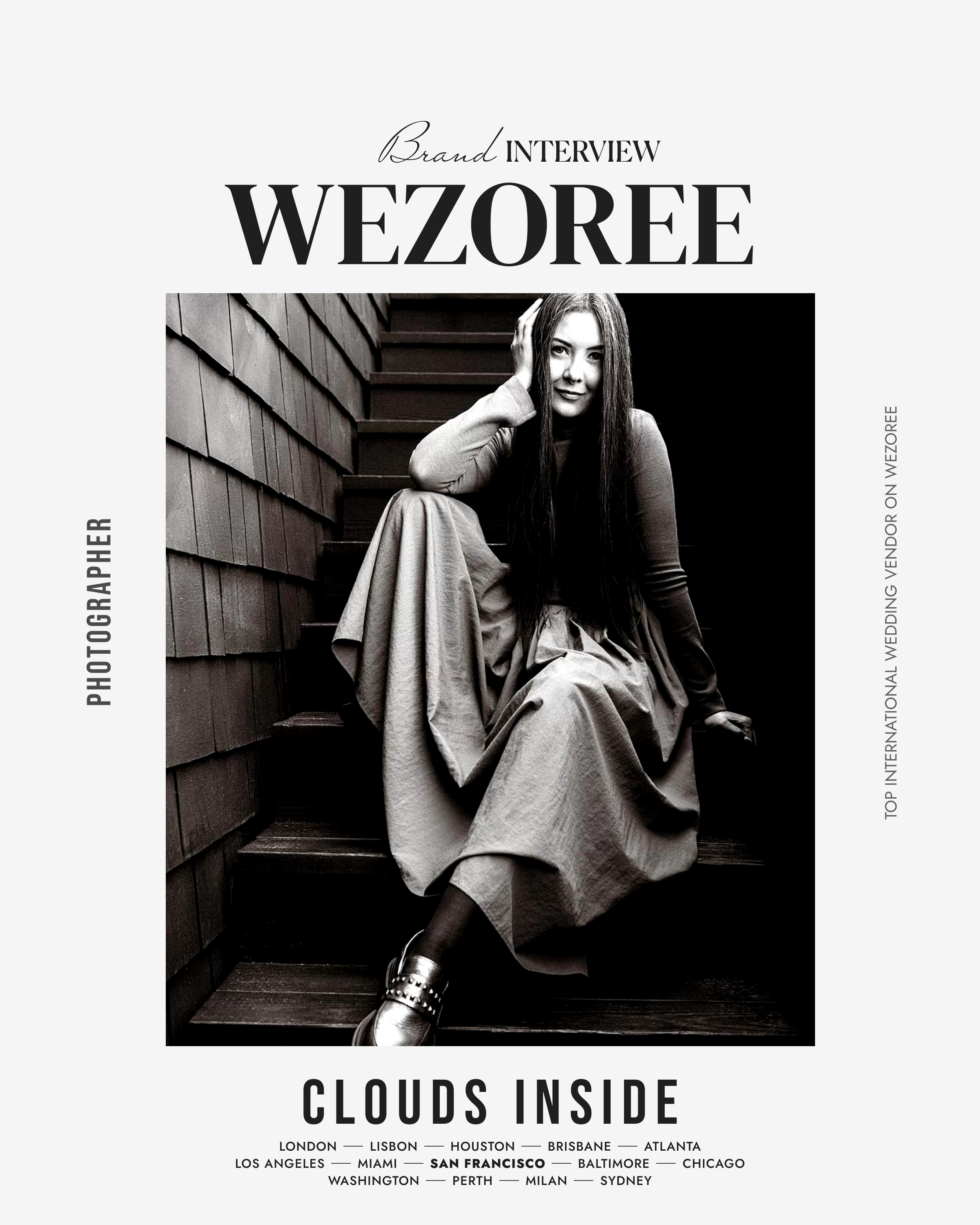 Clouds Inside, a photographer based in San Francisco and Los Angeles, has received 2 Wezoree Awards and has 12 reviews from satisfied clients. Specializing in various event types such as weddings, rehearsal dinners, engagement parties, and more, Clouds Inside offers a wide range of photography services including additional hours, destination/travel shoots, and drone photography. Their photography style encompasses fine art, artistic, and documentary styles, ensuring a unique and personalized touch to each client's photos.