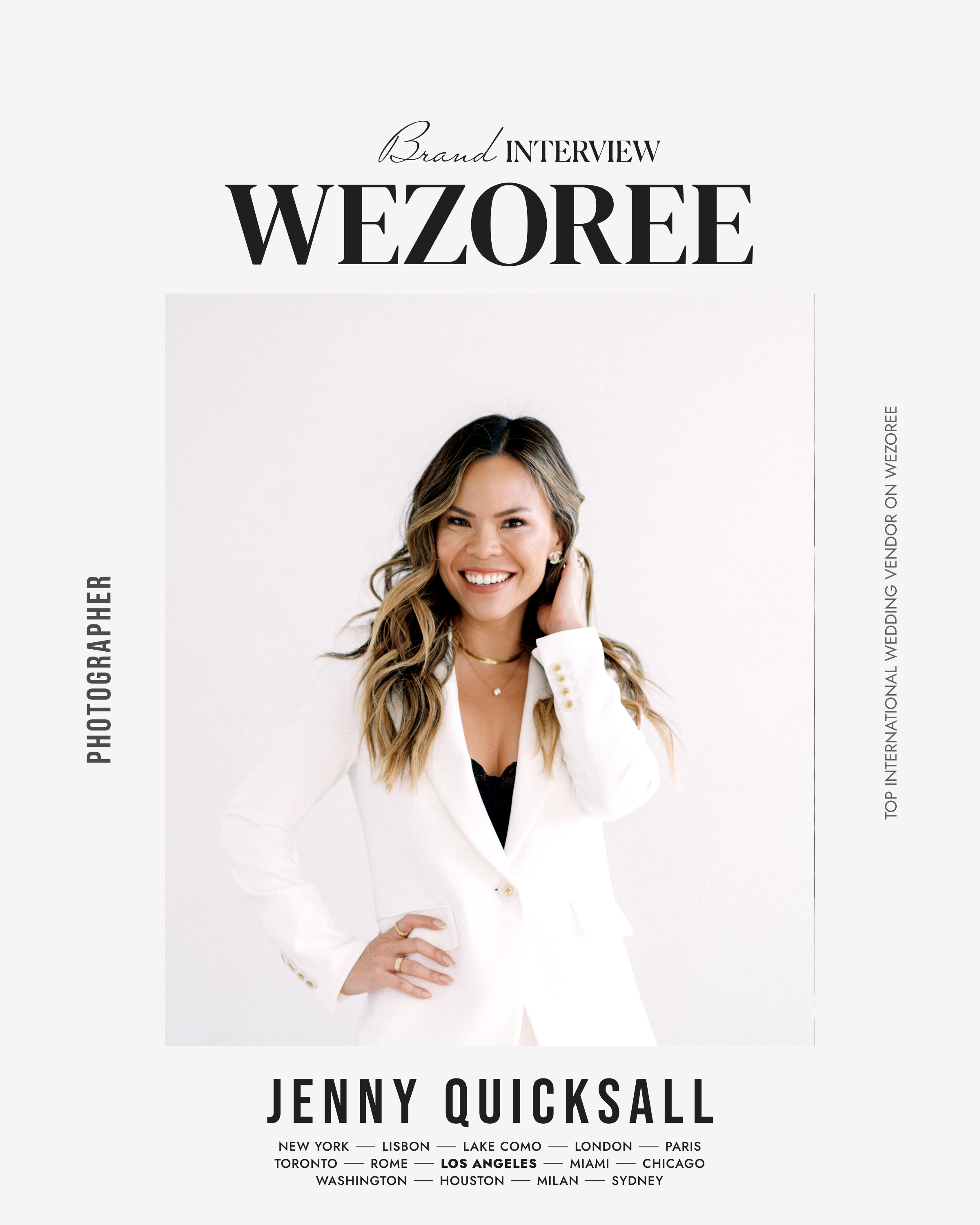 Hi—I’m Jenny, a Los Angeles Wedding Photographer who’s fueled by a fresh-air adventure, great fashion finds, and a good spa day (or two). Growing up, I was always the unofficial photographer among my friends and family. What started as a hobby quickly became a passion I couldn't shake. So, when I found myself less than thrilled at my job as a project manager, I made the decision to turn my love for photography into a career. With an MBA in marketing fr om Pepperdine and a dual BA degree in Economics and Psychology under my belt, I understood the importance of education and hard work—so I immediately set out to learn all there was to know about the world of photography. It was extremely important to me that I perfect my craft, develop a streamlined client experience, and create a signature look. Above all, I wanted to prove to myself and my daughters that it was possible to be both successful and happy. Named as a top wedding photographer by Brides, I’m beyond grateful that my work has been featured in publications ranging from Brides, Over The Moon, Martha Stewart Weddings and Style Me Pretty to The Knot and the cover of Inside Weddings. I’ve also been named the Best Photographer by California Wedding Day 5 years in a row. When I’m not behind my camera or connecting with (and styling!) couples, you can find me sculpting and sweating at a barre class, treating myself to a manicure, online shopping at Nordstrom, or spending time with my husband and our two incredible daughters. A lover of outdoor adventures and a serious Francophile, I spend much of my spare time dreaming about living in Paris wh ere I eat croissants at a sidewalk cafe and say things like c'est délicieux!. If you appreciate striking aesthetics and incredible adventures—I have a feeling we’ll get along swimmingly.