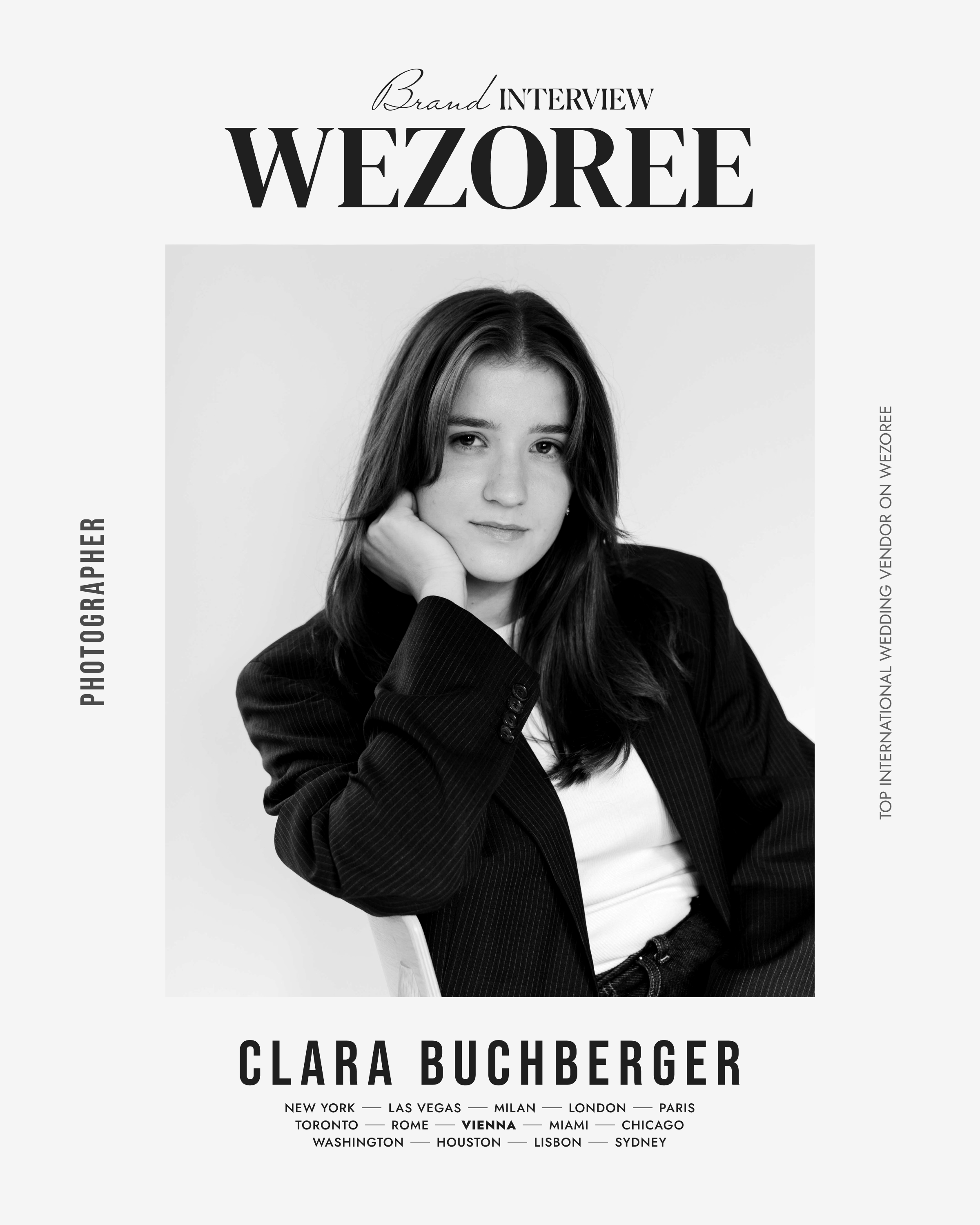 Nestled in the heart of baroque elegance, Vienna-based Clara Buchberger stands out with a camera in hand, more than a photographer, an artisan of memories. Her keen eye for detail and profound ability to encapsulate the essence of a couple's bond into a still frame is nothing short of remarkable.