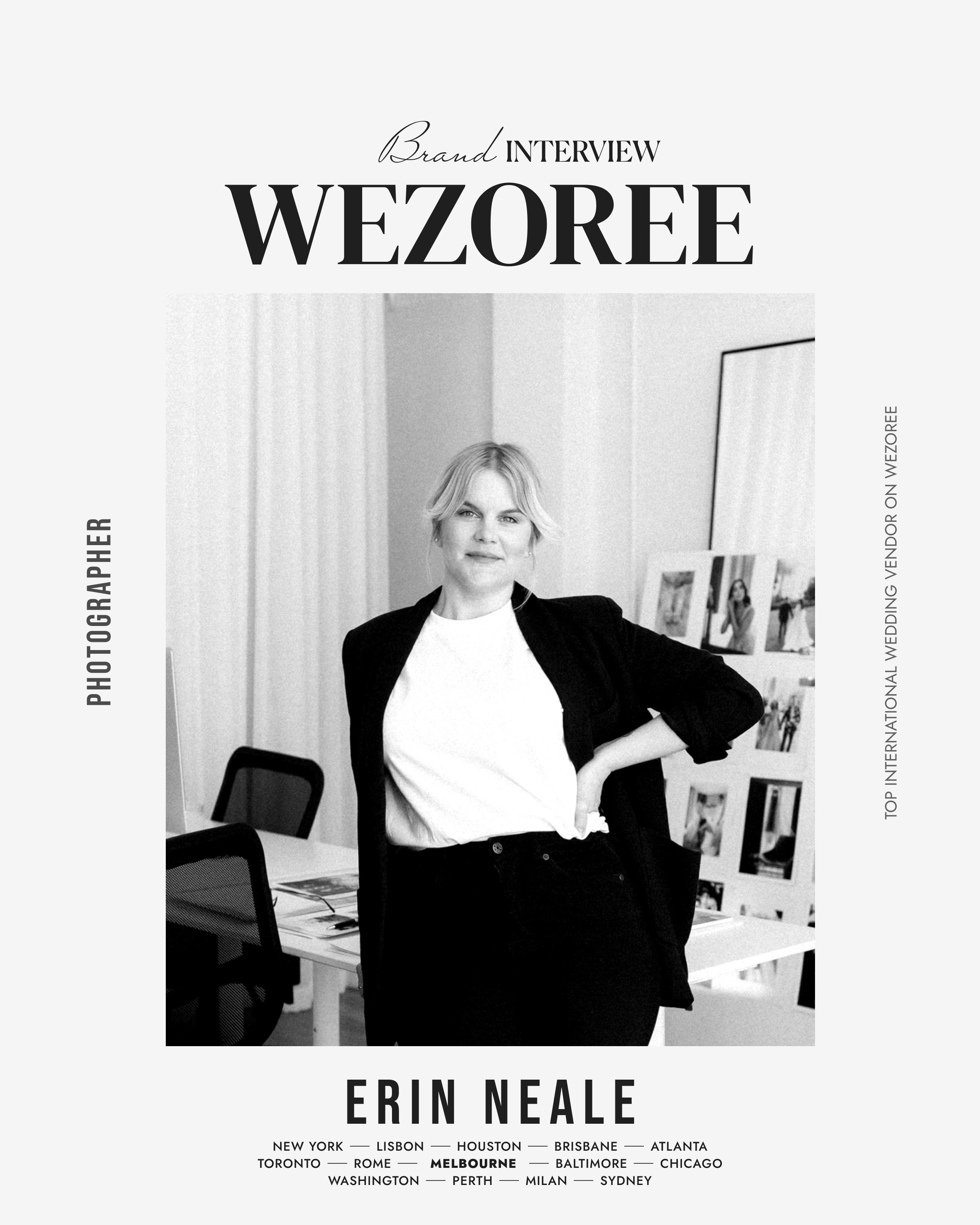Erin Neale is renowned for her potent and emotive photography; her intuitive and artful storytelling. Founder one of Australia’s leading wedding studios - Erin & Tara - in 2012, her work quickly became highly sought after and instantly recognisable, the emotional resonance of her images now iconic; the influence of her work, seen globally. With more than a decade of experience and having been behind the lens of some of the most stylish and soulful weddings, Erin continues to set an industry standard. Soulfully weaving together narrative and detail, her work blends an almost documentary style candour with the elegance and sophistication of high-end editorial.